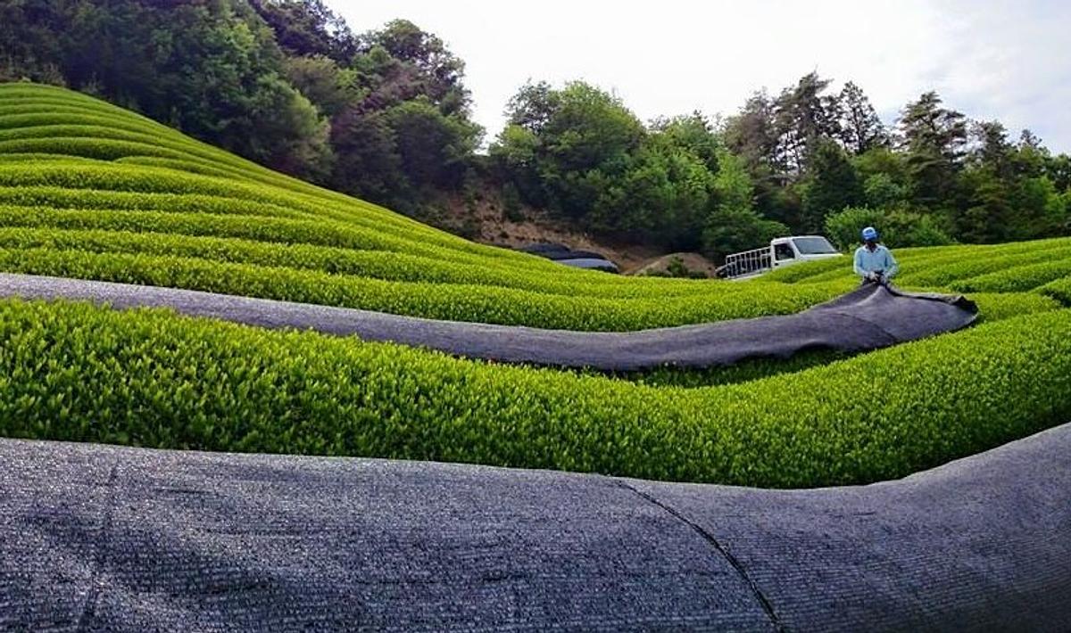 Zoals ik net al aangaf is de oogst van tencha net even anders als bij andere theeën. Enkele weken voor de reguliere oogst worden de theevelden afgedekt met netten om schaduw te creëren waardoor zonlicht minder invloed op de theeblaadjes uitoefent op het aanmaken van het antioxidant catechine die thee een bittere smaak geeft. Er moet echter nog wel wat zonlicht doorheen komen zodat de plant nog wel het gevoel heeft te moeten groeien). Door dit proces van zo’n 10 dagen krijg je hele dunne theebladeren met een mooie specifieke helder groene kleur, er kan voor gekozen worden om dit bv. voor 20 à 30 dagen te doen maar dan zullen de theebladere minder helder groen zijn, voor matcha wil je juist zo helder mogelijke groene bladeren.